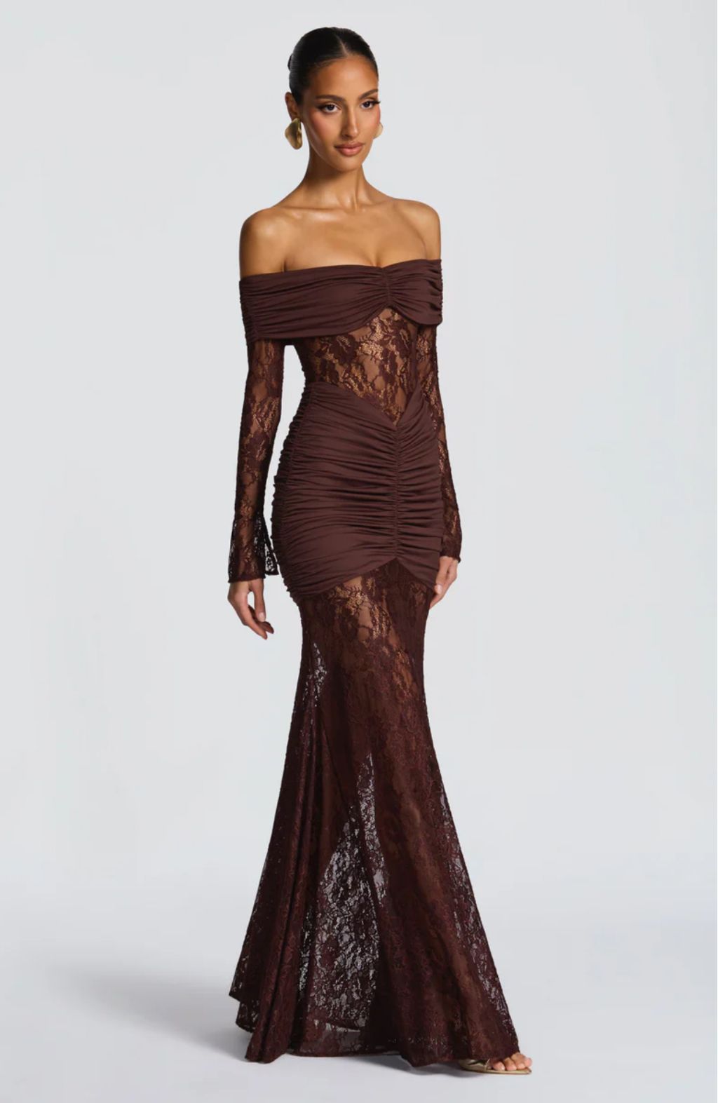 - Φόρεμα off shoulder με ανοιχτό heart shaped ντεκολτέ και σούρες που σμιλεύουν το σώμα στη μπροστινή και πίσω όψη.