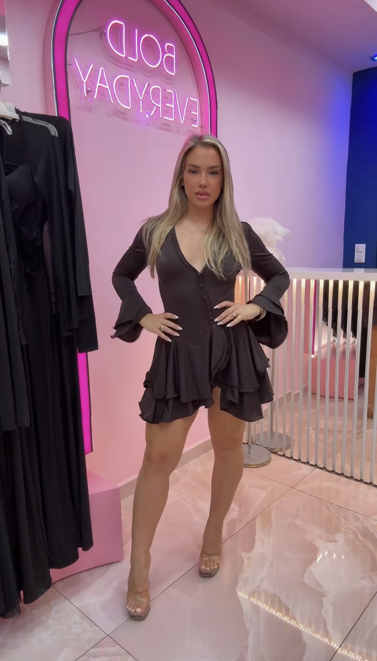 - Μάξι ασύμμετρο φόρεμα με κουμπιά και βολάν στο τελείωμα.
